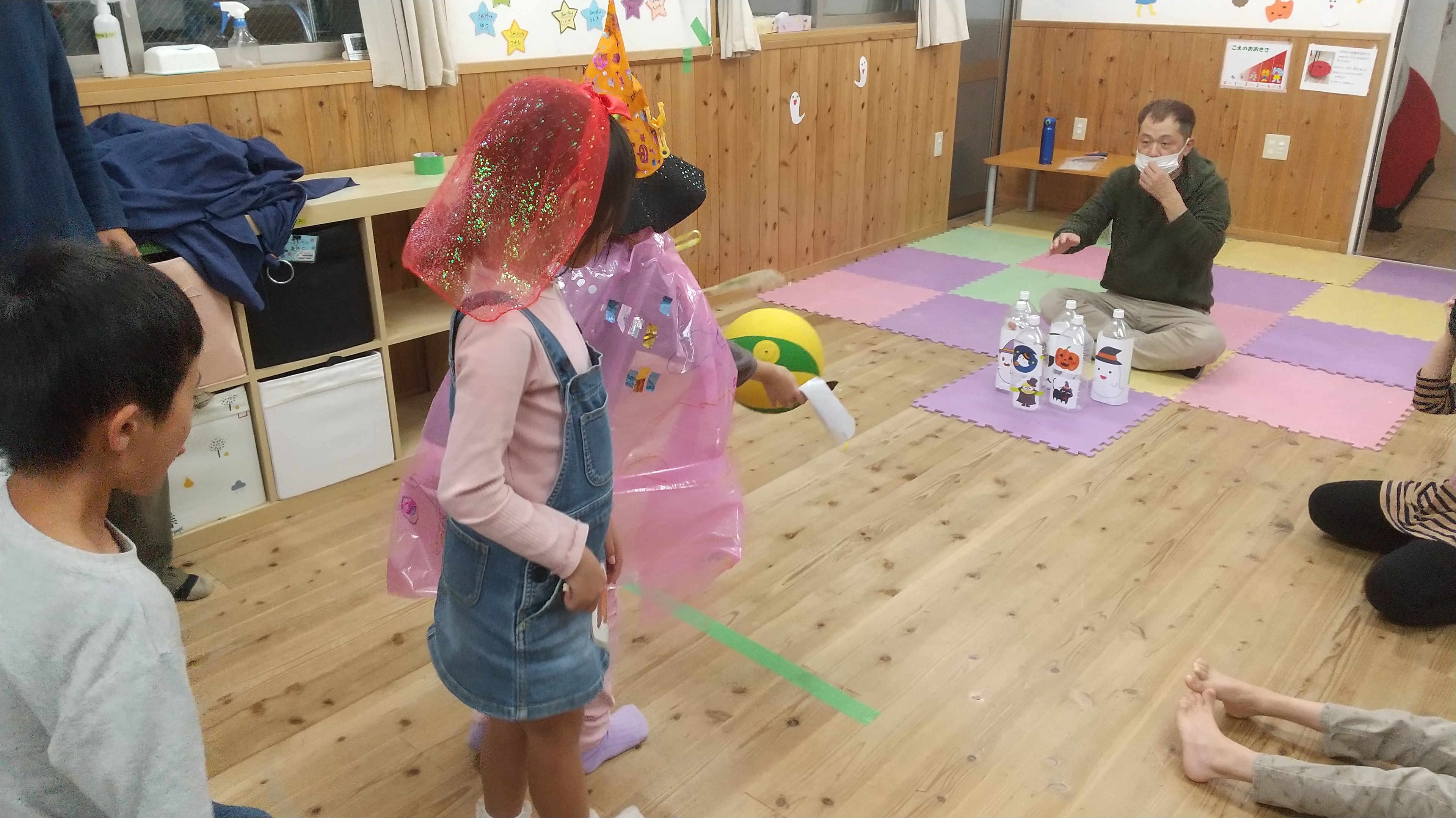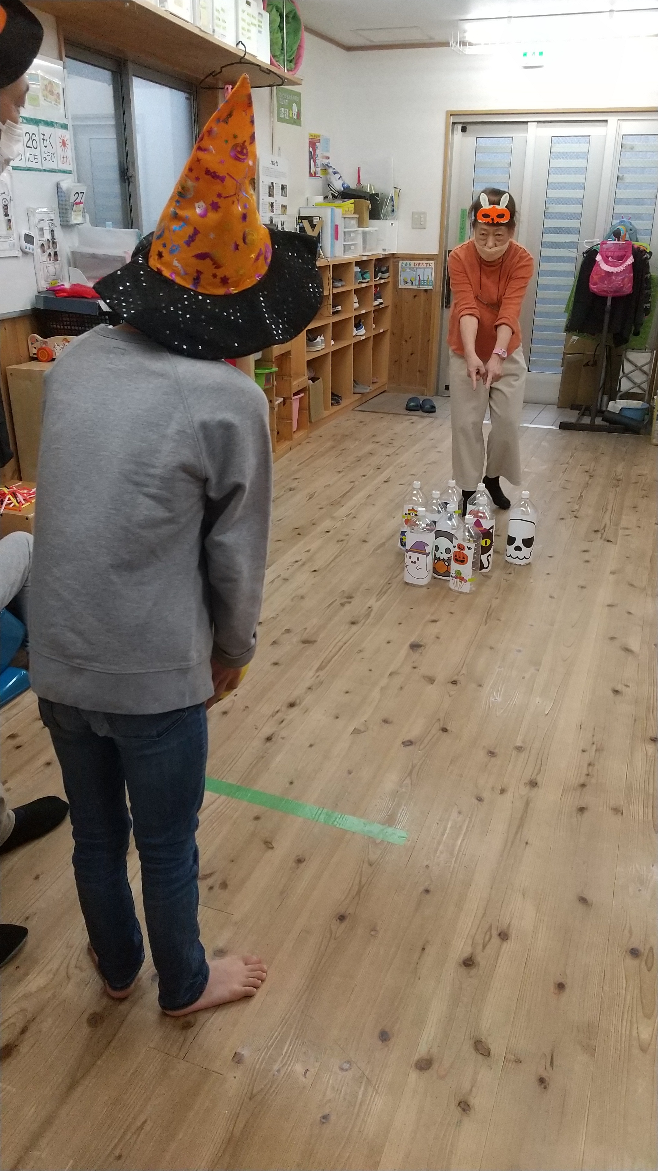 みんなで仮装する服をつくって着たり、人形劇、おばけにキャンディーをあげたりボーリングゲームをやりました。